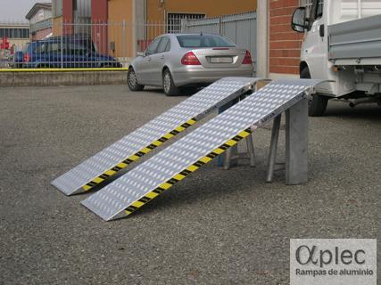 En la parte del acceso desde el suelo a la plataforma, la superficie del carril está reforzada. De esta forma se aumenta la resistencia y se alarga, de forma relevante, la vida útil de la plataforma. Ideales, para la carga y descarga de aparatos y vehículos o máquinas ligeras, mediante una rampa única. Imprescindibles cuando dichos aparatos y vehículos o máquinas dispongan de ruedas cruzadas, por ejemplo de tres ruedas (una rueda a la derecha y otra a la izquierda en el eje delantero y una única rueda en medio en el eje trasero).